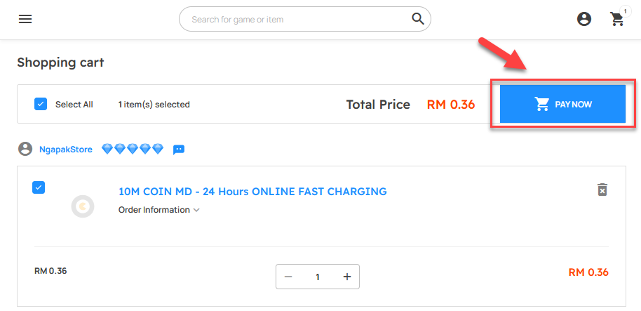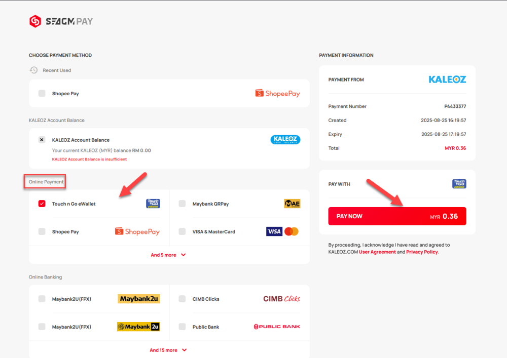 Step 2: On the checkout page, look for the "Online Payment" section and select "Touch n Go eWallet" as your preferred payment method, then select "Pay now".