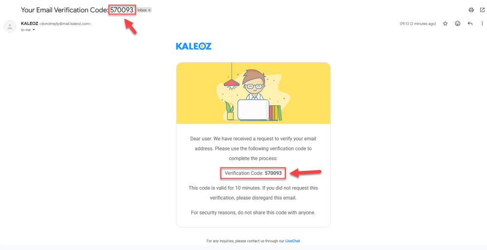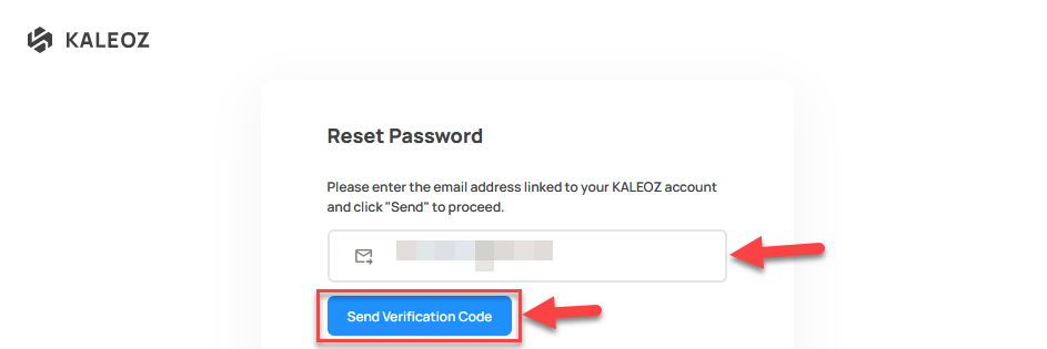 Step 3: Enter the email address associated with your KALEOZ account, then click 'Send Verification Code' to receive your verification code.