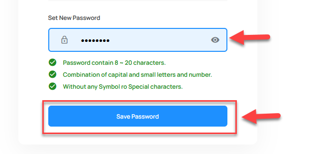 Step 6: Enter a new password containing 8–20 characters, including both uppercase and lowercase letters and at least one number. Do not use any symbols or special characters. Click 'Save Password' to complete the password reset process.